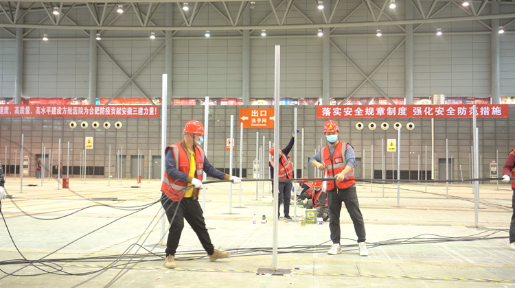 安徽三建黨委書記、董事長何洪春連夜立即召開動員會,要求高速度、高質(zhì)量、高標(biāo)準(zhǔn)完成方艙醫(yī)院建設(shè)任務(wù)!公司組織精兵強(qiáng)將,調(diào)集60多名管理人員和近700名工人迅速投入現(xiàn)場施工。公司安排副總經(jīng)理樊剛駐點(diǎn)一線指揮協(xié)調(diào)。項(xiàng)目部調(diào)動一切力量,克服一切困難,發(fā)揮產(chǎn)業(yè)鏈和資源優(yōu)勢,24小時(shí)搶工期保進(jìn)度。