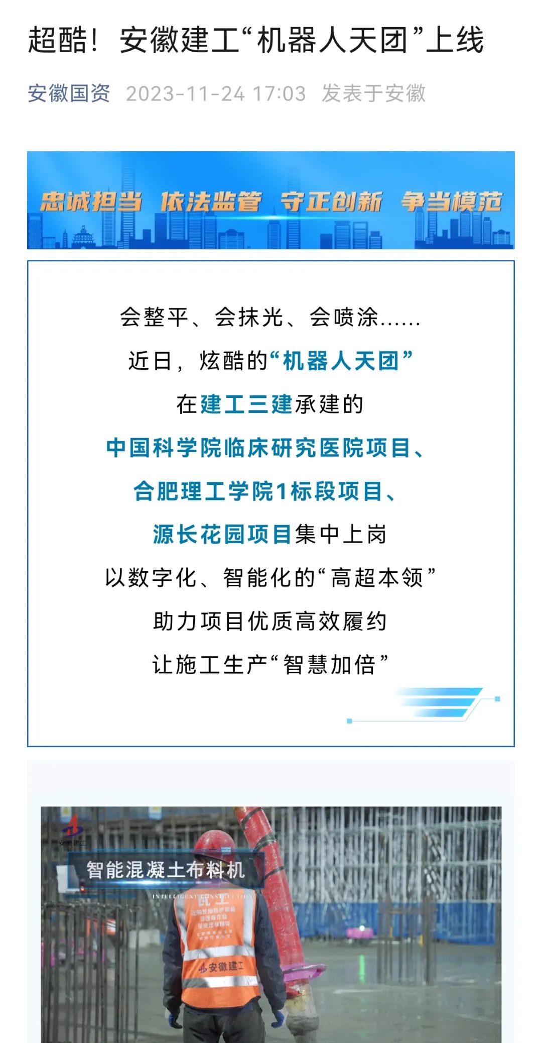 11月23日,中新網(wǎng)、安徽國(guó)資、合肥晚報(bào)以“建筑工地迎‘機(jī)器人天團(tuán)’安徽建工三建集團(tuán)開(kāi)啟智能建造新篇章”為題,專(zhuān)題報(bào)道公司首批引進(jìn)五臺(tái)建筑機(jī)器人助力項(xiàng)目高質(zhì)量建設(shè),開(kāi)啟智能建造新篇章,受到廣泛關(guān)注。截至發(fā)稿時(shí),閱讀量已超20萬(wàn)次。