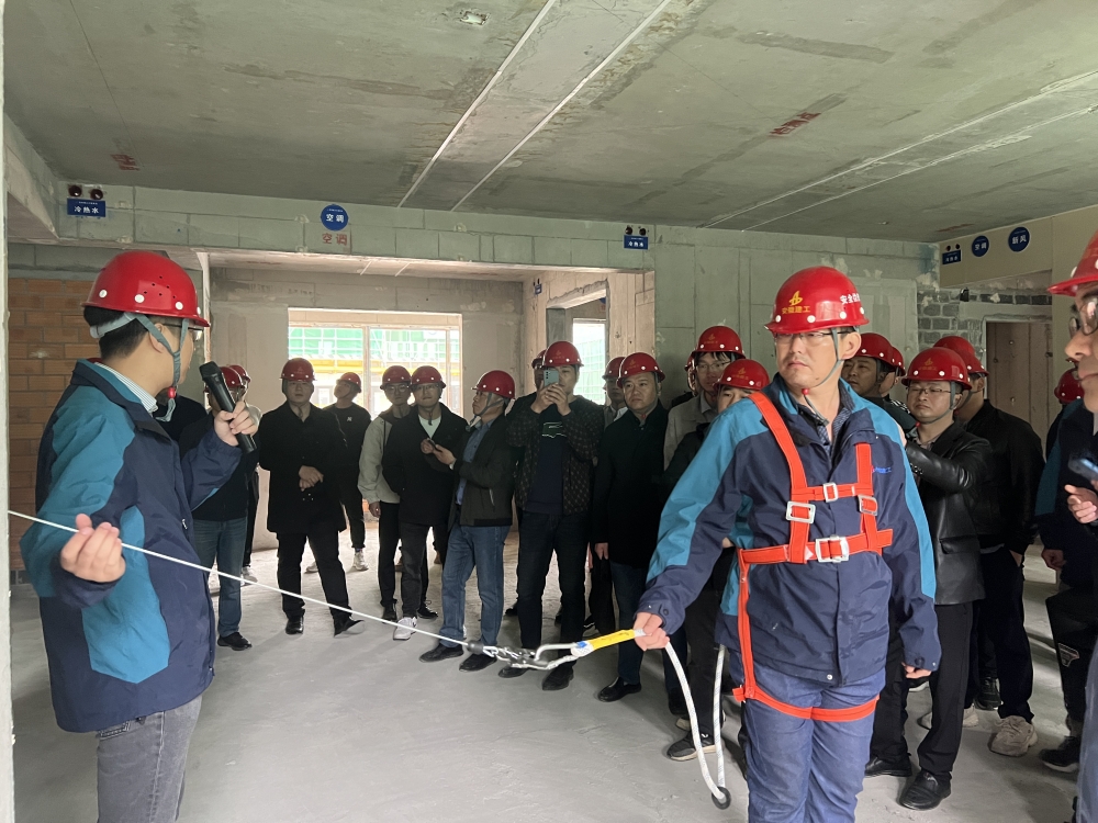 觀摩人員一行聽取了項目工程概況以及質量、成本、安全等方面管控措施的匯報,重點參觀了項目智慧展廳、5#樓樣板間、機器人停放區(qū)及施工作業(yè)層,并就項目相關亮點做法進行深度交流,項目經(jīng)理姜正寶就安全管控措施及主體結構施工工藝與觀摩人員進行詳細探討。