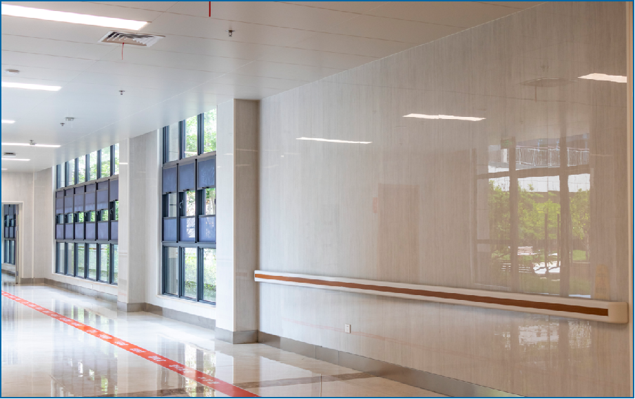 設(shè)計(jì)上,摒棄了傳統(tǒng)醫(yī)院病房樓的直通式走廊,形成類似“街道+廣場(chǎng)”的空間,成為充滿生活氛圍的社區(qū)交往空間,延續(xù)家居感覺(jué)。根據(jù)不同使用人群(失能、失智老年人、自理老人)的需求,設(shè)置不同的配套服務(wù)功能,以康養(yǎng)軸連接南、北、中部各功能模塊,利用無(wú)障礙人行通道形成風(fēng)雨無(wú)阻的步行系統(tǒng)。設(shè)置智能適老化看護(hù)管理系統(tǒng)和無(wú)障礙智能載人天軌系統(tǒng),施工策劃全面考慮運(yùn)營(yíng)需求,確保系統(tǒng)平穩(wěn)運(yùn)行且無(wú)交叉、無(wú)干擾。
