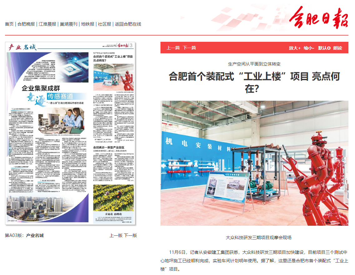近日,合肥日?qǐng)?bào)、合肥晚報(bào)等主流媒體聚焦報(bào)道公司承建的合肥市首個(gè)裝配式“工業(yè)上樓”項(xiàng)目——大眾科技研發(fā)三期項(xiàng)目亮點(diǎn)及最新進(jìn)展,受到廣泛關(guān)注。