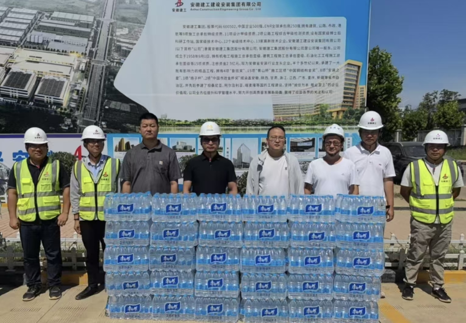 7月10日上午,鳳陽縣重點(diǎn)工程建設(shè)管理服務(wù)中心質(zhì)量安全股主任姜銳一行到公司鳳陽縣小崗村農(nóng)產(chǎn)品加工產(chǎn)業(yè)園三期建設(shè)北區(qū)項(xiàng)目調(diào)研開工建設(shè)情況,并為高溫堅守崗位的一線建設(shè)者“送清涼”。