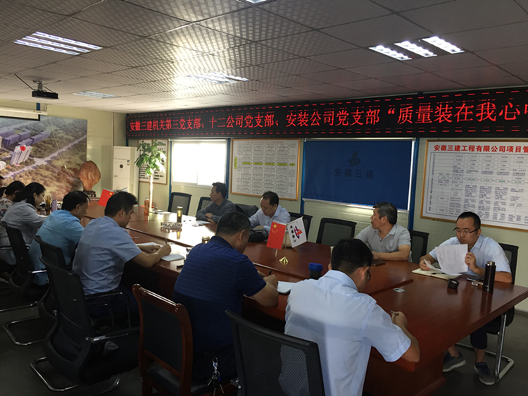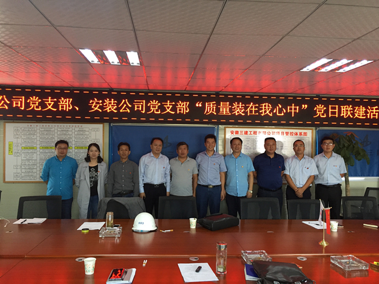 為了更好地落實全國的“質(zhì)量月”活動,進(jìn)一步提高公司員工的質(zhì)量意識,提高公司總體質(zhì)量水平。安徽三建機關(guān)第三黨支部、十二公司黨支部和安裝公司黨支部聯(lián)合開展主題為“質(zhì)量裝在我心中”的主題黨日活動。十二公司經(jīng)理周詩奎,技術(shù)質(zhì)量部副主任潘文同,成本合約部以及安全生產(chǎn)管理部相關(guān)黨員和入黨積極分子共12人參加黨日聯(lián)建活動。