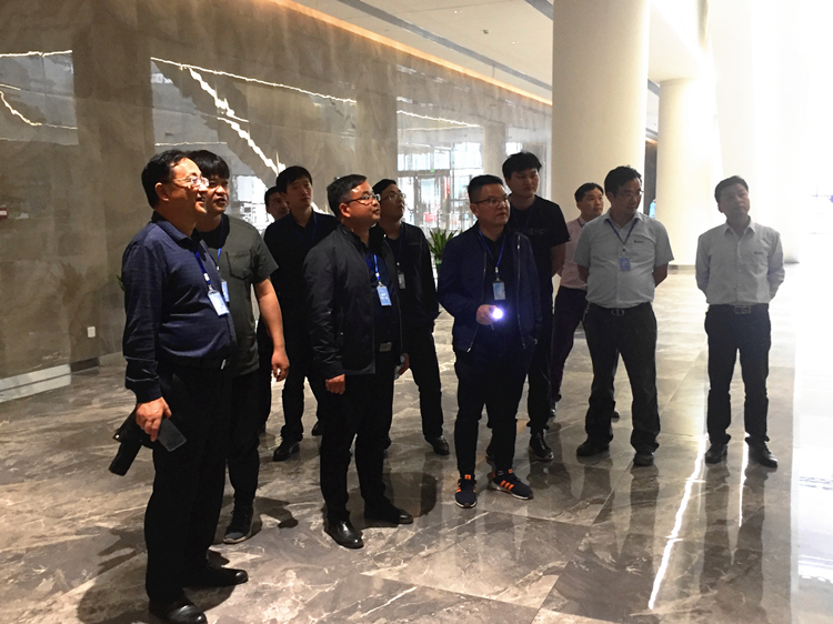 觀摩中,孫俊中對(duì)所有項(xiàng)目人員表示親切的慰問(wèn),在現(xiàn)場(chǎng)聽(tīng)取了項(xiàng)目負(fù)責(zé)人王皖對(duì)安徽創(chuàng)新館整體建設(shè)情況介紹。隨后孫俊中一行參觀了二號(hào)館、三號(hào)館。裝飾公司項(xiàng)目經(jīng)理劉維向觀摩團(tuán)介紹了二號(hào)館室內(nèi)環(huán)氧磨石工藝、PVC石塑地板鋪貼技術(shù)以及三號(hào)館全球路演中心超大型藝術(shù)造型鋼板安裝技術(shù)等等。館內(nèi)光可鑒人的環(huán)氧磨石地面、輕質(zhì)飄逸的穿孔鋁板、氣勢(shì)宏偉的路演中心給孫俊中一行留下深刻印象。