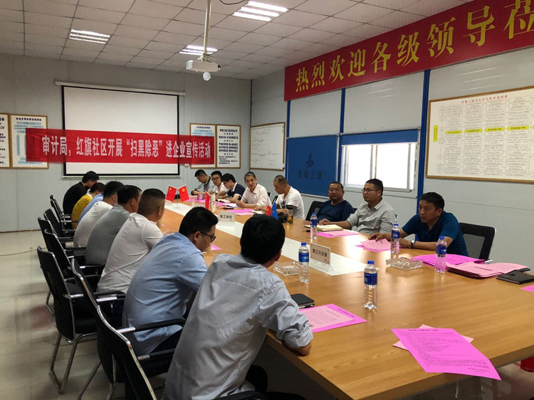 阜南縣審計局、紅旗社區(qū)在阜南縣委家屬院項目部開展“掃黑除惡”進企業(yè)宣傳活動
