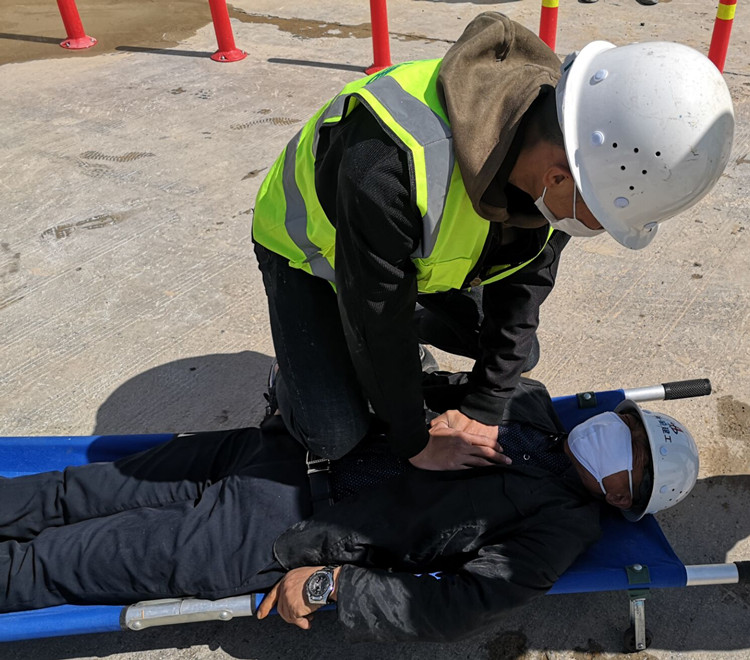 演習(xí)中,突發(fā)火災(zāi)報(bào)警聲響起后,滅火組、疏散組、警戒組、搶救組迅速到位,滅火組立即拎起滅火器沖向著火點(diǎn)進(jìn)行滅火;疏散組迅速趕往施工現(xiàn)場、樓梯間及安全出口處,通過口令加手勢(shì),指揮現(xiàn)場施工人員從指定路線有秩序疏散到安全地帶,并做好人員的清點(diǎn)統(tǒng)計(jì);警戒組在著火點(diǎn)做人群隔離,并對(duì)通道進(jìn)行清理,以便消防車進(jìn)入;搶救組立即用擔(dān)架就將受傷人員抬離安全地帶,并實(shí)施搶救措施。演練現(xiàn)場大家按照項(xiàng)目部編制的《火災(zāi)應(yīng)急救援預(yù)案》,緊張、迅速、有序?qū)馂?zāi)事故警報(bào)做出反應(yīng),順利完成演練工作。