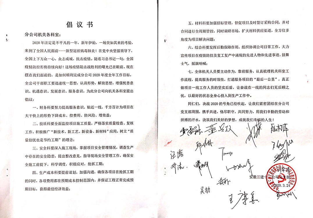 面對(duì)疫情的影響,十一公司堅(jiān)定信心決定,咬定目標(biāo)不放松,鼓干勁,見行動(dòng)。3月24日,十一公司黨支部在分公司范圍內(nèi)發(fā)起倡議書,要求全體職工要迅速統(tǒng)一思想,認(rèn)清形勢,立足本職崗位,及時(shí)有效的完成自己的工作,為了順利完成分公司2020年全年工作目標(biāo)努力拼搏。