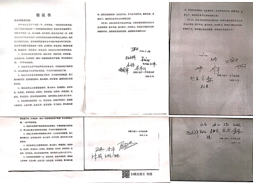 分公司黨支部在倡議書中號(hào)召,全體項(xiàng)目部要團(tuán)結(jié)一心、堅(jiān)定信念,發(fā)揚(yáng)不畏艱苦、迎難而上的精神,腳踏實(shí)地、真抓實(shí)干,確保項(xiàng)目各節(jié)點(diǎn)目標(biāo)如期完成;全體機(jī)關(guān)人員要主動(dòng)作為、靠前服務(wù),加強(qiáng)溝通、積極宣傳,一切圍繞項(xiàng)目進(jìn)度開展工作,保證服務(wù)的時(shí)效性。