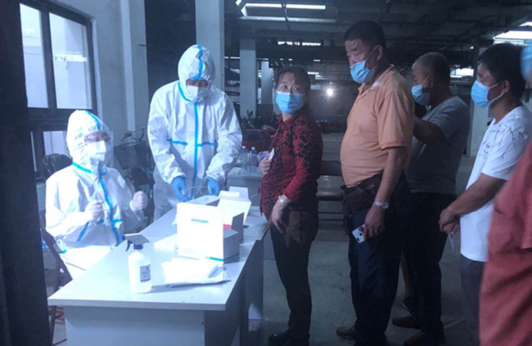 為了確保生產(chǎn)經(jīng)營和防疫工作兩不誤,金連領地項目經(jīng)理主動與街道溝通,確認檢測時間,合理分組安排人員檢測,減少對項目施工的影響。為了避免人員聚集。晚間6點,社區(qū)居民全部檢測完畢以后,項目經(jīng)理將15名管理人員和160名工人分為三組,由管理人員分時段帶領工人前往社區(qū)指定地點進行核酸檢測。為了減輕社區(qū)和防疫工作者的壓力,每隊的小隊長預先對所有工人進行體溫檢測,自我篩查是否有體溫異常的工人,提前指導工人做好信息登記工作,減輕醫(yī)護人員的工作量,加快核算檢測工作進展。