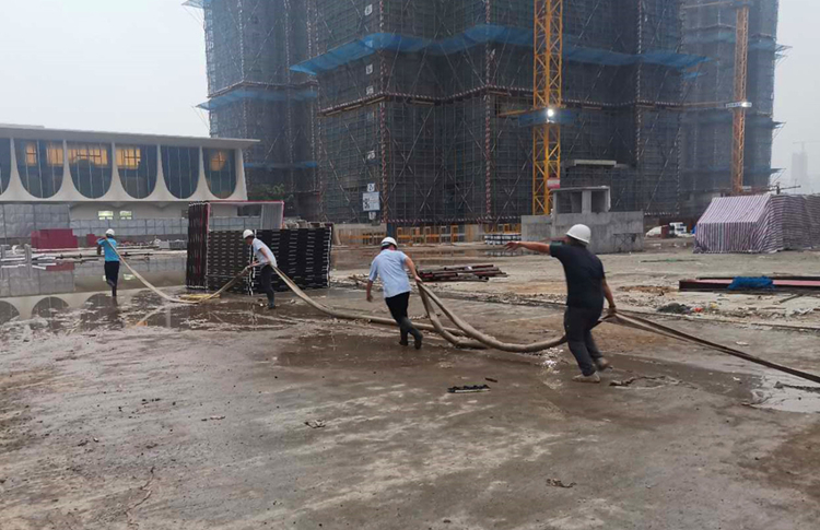 必須立即將4萬(wàn)立方米的積水排出!項(xiàng)目經(jīng)理范夢(mèng)陽(yáng)只有這一個(gè)念頭。就在地庫(kù)旁,他冷靜地組織項(xiàng)目經(jīng)理、技術(shù)骨干、安全員、班組長(zhǎng)成立臨時(shí)排澇應(yīng)急搶險(xiǎn)小組,實(shí)施搶險(xiǎn)排澇工作。然而困難是從地庫(kù)到市政管網(wǎng)之間的排水距離長(zhǎng)達(dá)1000米,水泵壓力不足,長(zhǎng)時(shí)間不間斷的抽水勢(shì)會(huì)導(dǎo)致水泵燒毀。另外,水中的雜物也可能引起水泵風(fēng)葉堵塞,導(dǎo)致短路。