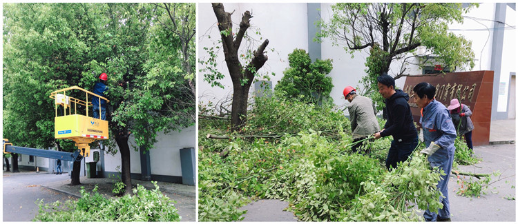 在修剪的過程中,由于樹木參差不齊,有的已經(jīng)觸碰到電線,非常危險,處理起來比較困難,設(shè)備租賃公司黨支部為了解決這一難題,采取應(yīng)對措施----租借升降車,工作人員利用專業(yè)油鋸在保證自身安全的情況下,對樹木進(jìn)行修剪,遇到較高、粗壯的樹枝也是一遍又一遍耐心的鋸割,大伙兒有的鋸樹枝、有的搬木頭、有的清掃垃圾……分工合作,相互配合,干的熱火朝天、忙的不亦樂乎,一個個汗流浹背。最后將修剪下來的大樹枝被及時清運(yùn),保證新基地行人車輛的安全通行。經(jīng)過一天緊張有序的工作,整個新基地的環(huán)境煥然一新。