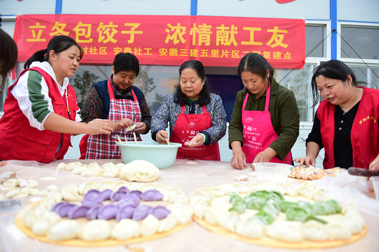 安徽三建五里片區(qū)項目臨時黨支部與汲橋社區(qū)志愿者聯(lián)合開“立冬包餃子 濃情獻工友”活動