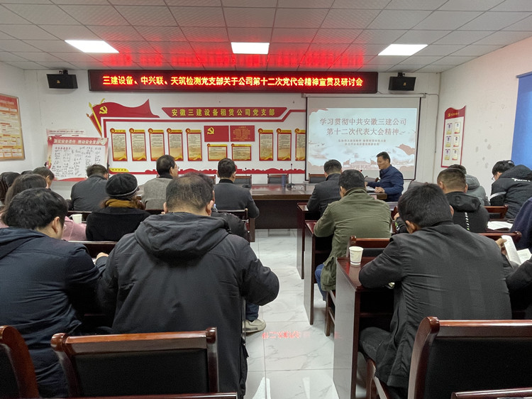 為深入學(xué)習(xí)貫徹公司第十二次黨代會精神,12月10日下午,設(shè)備租賃公司黨支部與安徽建機所屬中興聯(lián)租賃公司、天筑檢測公司黨支部聯(lián)合舉辦公司第十二次黨代會精神宣貫及研討會。三家單位共計40余人參加了學(xué)習(xí)。