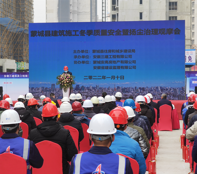 為切實(shí)做好蒙城縣建筑工程冬季施工質(zhì)量安全及揚(yáng)塵治理管理工作,加強(qiáng)施工現(xiàn)場(chǎng)管理經(jīng)驗(yàn)的學(xué)習(xí)與交流,提高從業(yè)人員質(zhì)量安全生產(chǎn)意識(shí),推進(jìn)質(zhì)量安全生產(chǎn)標(biāo)準(zhǔn)化工作落實(shí)到位,1月10日上午,蒙城縣建筑施工冬季質(zhì)量安全暨揚(yáng)塵治理觀摩會(huì)在安徽三建承建的蒙城高速時(shí)代首府項(xiàng)目順利召開(kāi)。 蒙城縣副縣長(zhǎng)劉鵬,縣住建局、應(yīng)急管理局、人社局等相關(guān)部門負(fù)責(zé)人以及全縣所有在建項(xiàng)目業(yè)主代表、項(xiàng)目經(jīng)理、總監(jiān)約200人參會(huì)。