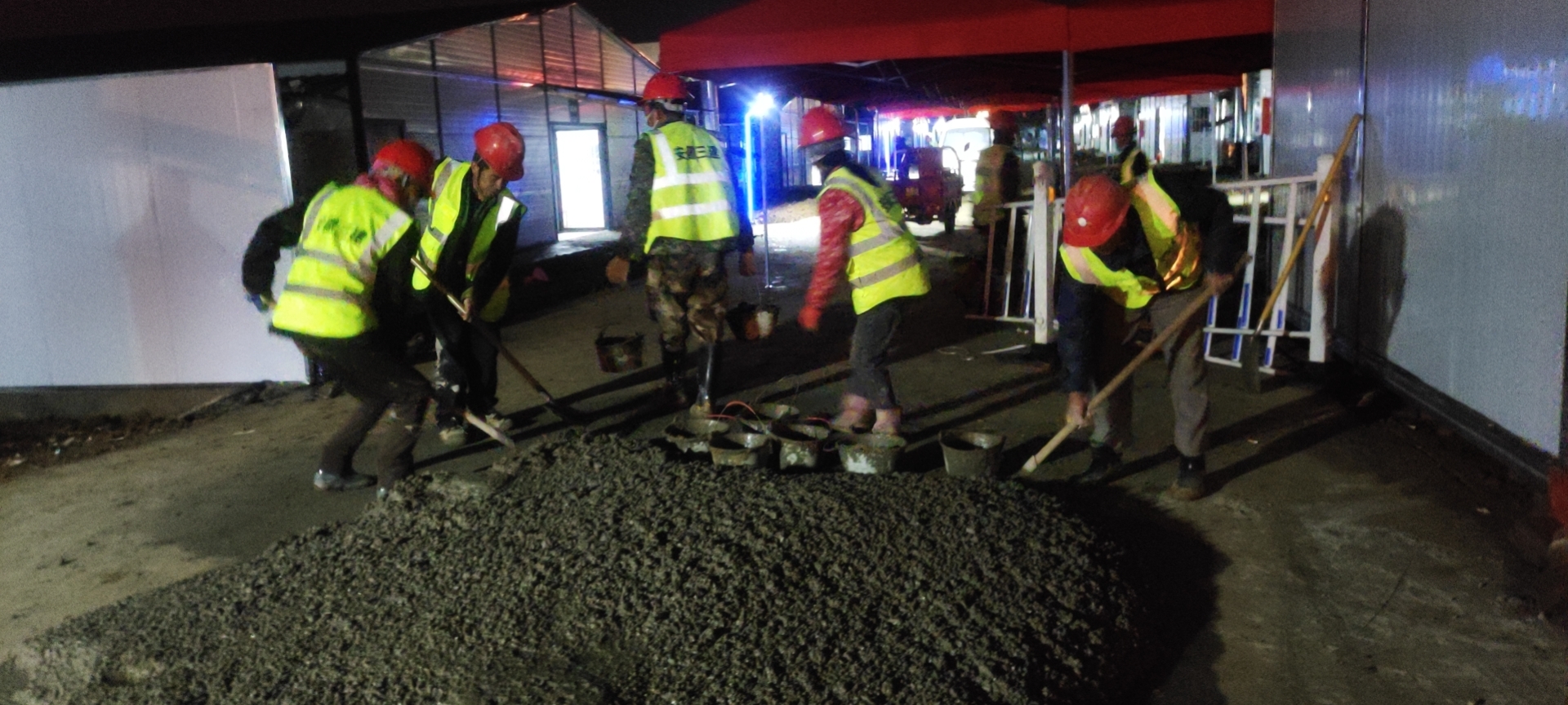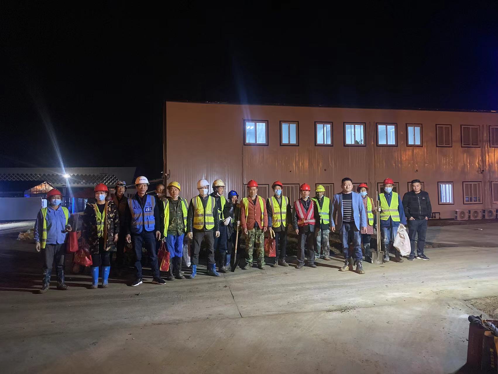 接到電話后,項目經(jīng)理立刻組織管理人員和現(xiàn)場班組,短短10分鐘內(nèi),有50名員工積極報名參與這個夜晚驛站建設(shè)的突擊任務(wù)。晚上8:00,各隊伍已列隊廬江縣健康驛站大門外集合完畢,與內(nèi)部工作人員簡單交談后,得知現(xiàn)場主要困難是集水溝槽的無人砌筑,施工機(jī)械無法到達(dá)指定地點等,必須采用人工運輸?shù)姆绞竭M(jìn)行材料運輸。由于情況緊急,現(xiàn)場立即組織分工,經(jīng)過長達(dá)幾個小時的奮戰(zhàn)之后,于凌晨1:20,廬江縣健康驛站24棟建筑長達(dá)3萬米的排水明溝全部砌筑完成,順利結(jié)束了本次突擊任務(wù)。