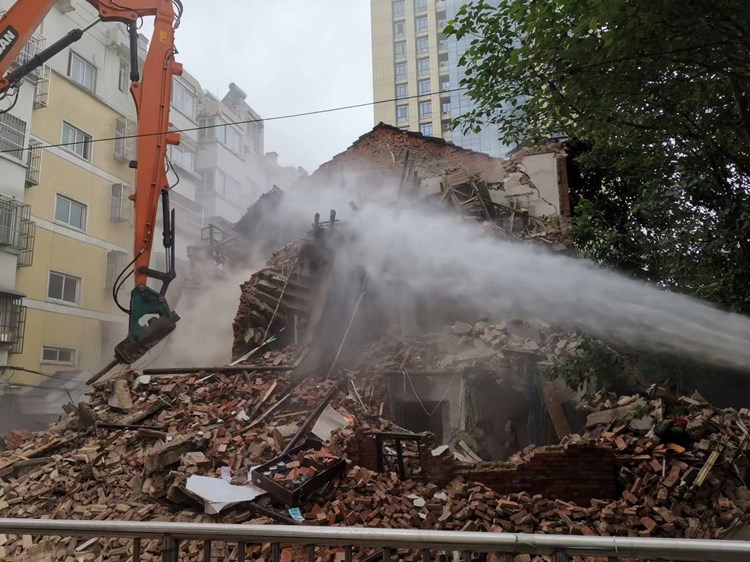 5月10日上午,合肥市蜀山區(qū)南七街道聯(lián)合城管、市場(chǎng)監(jiān)管、應(yīng)急、公安等部門開展拆除行動(dòng),建機(jī)家園小區(qū)“單身樓”周邊拉起了警戒線,道路口和單元樓出入口處均安排人員值守,建機(jī)公司人員協(xié)助街道工作人員對(duì)樓內(nèi)居民及其物品進(jìn)行勸導(dǎo)和搬離,一切就緒,挖掘機(jī)、灑水車現(xiàn)場(chǎng)作業(yè),伴隨著一陣陣轟鳴聲,一棟紅色磚墻的三層樓順利被拆除。