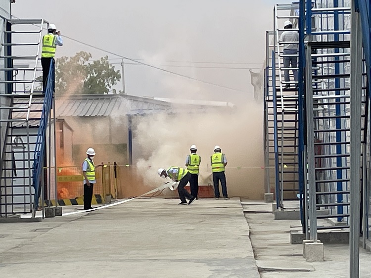 啟動儀式后,項目開展了模擬違規(guī)使用大功率電器導致失火的消防演練與違章作業(yè)未佩戴安全帶導致的高墜救援演練,演練參加人員進行了作業(yè)前的安全準備事項,現(xiàn)場人員的疏散,滅火器、消防栓的使用,應急處理措施、緊急綁扎以及應急救援上報等流程的演練。