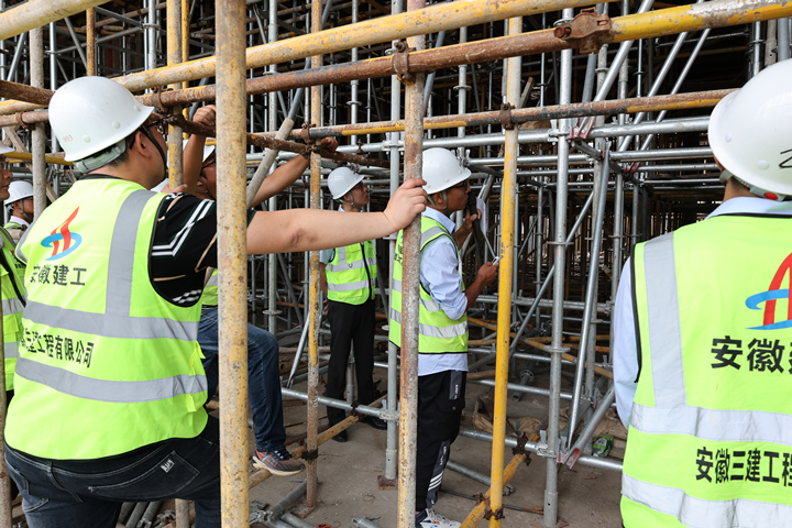 承諾簽名活動結(jié)束后,根據(jù)活動方案議程組織全員開展高支模盤扣式支撐體系學(xué)習(xí)交流活動,因安徽省公共衛(wèi)生臨床中心(蕪湖)項(xiàng)目地下室結(jié)構(gòu)復(fù)雜,模板支撐體系均屬于超過一定規(guī)模的危險(xiǎn)性較大的分部分項(xiàng)工程,根據(jù)蕪湖市相關(guān)規(guī)范要求均須使用鍍鋅盤扣腳手架,通過介紹盤扣架高大模板支撐體系搭設(shè)規(guī)范要求、施工安全監(jiān)督管理要點(diǎn)、難點(diǎn)問題解惑與重大隱患排查治理、掛牌督辦、跟蹤整治經(jīng)驗(yàn)交流來強(qiáng)化員工對高支模盤扣架安全工作重要性的認(rèn)識,也提升了項(xiàng)目一線員工的現(xiàn)場管理水平。