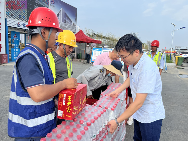 7月27日下午,花崗鎮(zhèn)工會聯(lián)合會主任陳偉等一行來到安徽三建肥西產(chǎn)融項目開展“送清涼”活動。為項目一線人員發(fā)放礦泉水、王老吉等防暑降溫用品,為烈日下的施工人員送去關(guān)懷和慰問。肥西產(chǎn)融項目黨支部書記石燚銳,指揮部工程管理部負責人黃波參加活動。