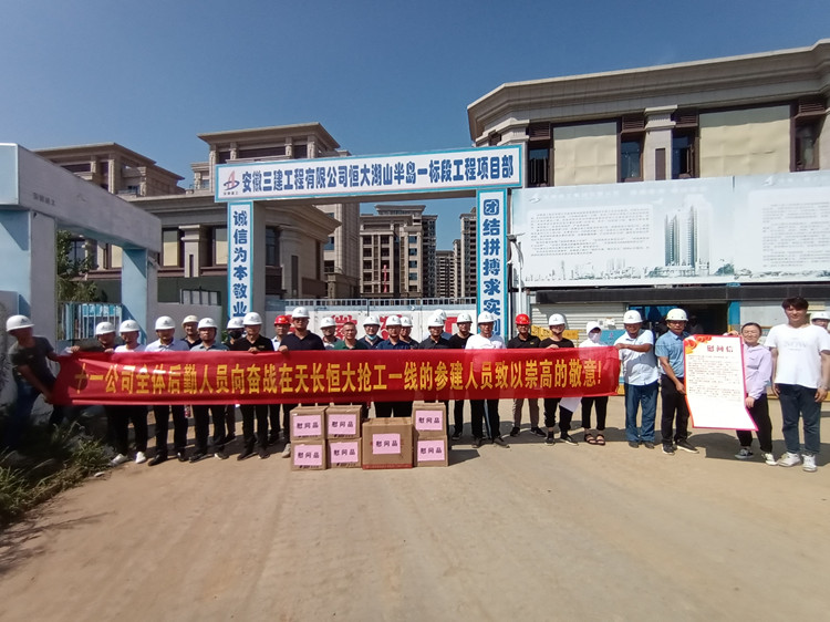 時(shí)值八月,正是最炎熱艱苦的季節(jié),卻也是項(xiàng)目生產(chǎn)的黃金時(shí)期。8月5日上午,十一公司全體后勤人員前往天長(zhǎng)恒大湖山半島項(xiàng)目開(kāi)展慰問(wèn)活動(dòng),向始終奮戰(zhàn)在搶工一線的參建人員送上一封聯(lián)名手寫的慰問(wèn)信和慰問(wèn)品,對(duì)他們表示衷心的感謝并致以崇高的敬意。