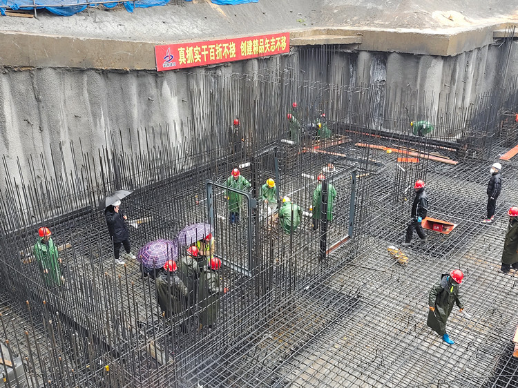 自2022年9月項(xiàng)目正式開(kāi)工以來(lái),項(xiàng)目克服了疫情封控、揚(yáng)塵管控、土方外運(yùn)難、地下管線拆改、施工及交通環(huán)境復(fù)雜等一些列施工難題,緊鑼密鼓開(kāi)展生產(chǎn)。2023年初,項(xiàng)目接到業(yè)主單位下達(dá)春節(jié)前停車樓筏板基礎(chǔ)完成的節(jié)點(diǎn)目標(biāo),項(xiàng)目部第一時(shí)間部署搶工工作,面對(duì)復(fù)雜的勁性混凝土人防工程,項(xiàng)目部管理人員與各班組勞務(wù)人員展開(kāi)為期十天的勞動(dòng)沖刺,采用日夜兩班倒、停人不停機(jī)搶工模式,終于在15日凌晨完成停車樓筏板最后一方混凝土澆筑,耗時(shí)11個(gè)小時(shí),順利完成年前施工任務(wù)。