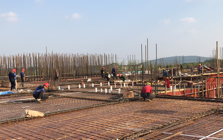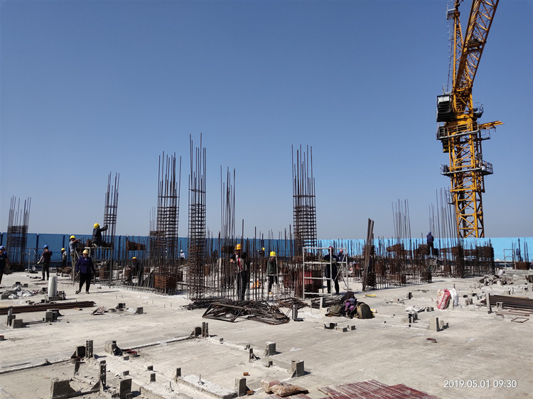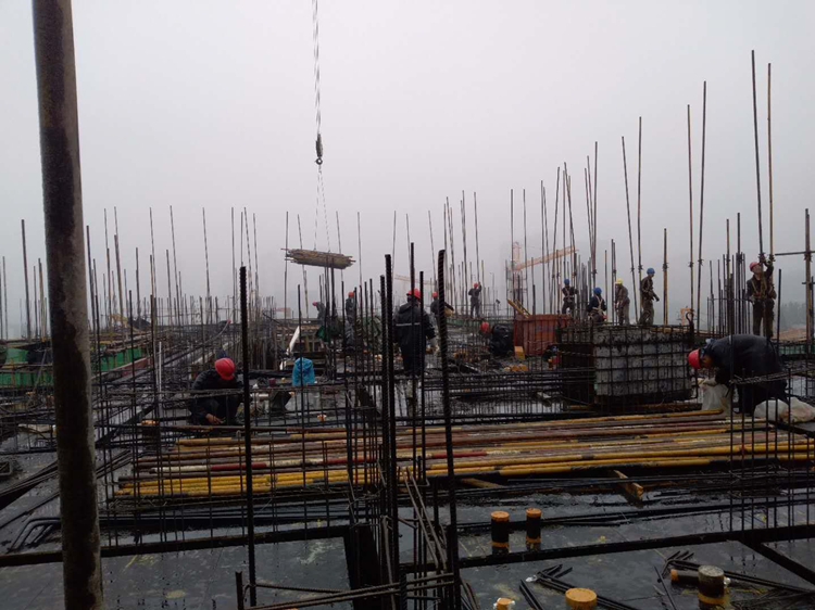 5月2日,十一公司天長(zhǎng)恒大I標(biāo)項(xiàng)目班組綁扎基礎(chǔ)承臺(tái)鋼筋。