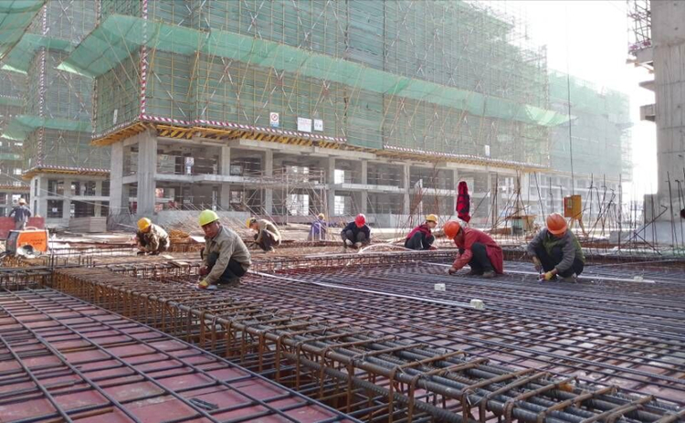 八公司臨泉銀杏苑項(xiàng)目:工人師傅軋鋼機(jī)、支模板,大家各司其職、相互協(xié)作。
