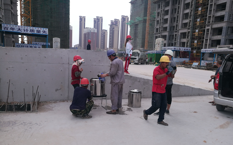 三伏天到撲面而來的熱氣令人眩暈,持續(xù)的高溫天氣中,為了項目進度質(zhì)量,防水公司依舊奮戰(zhàn)在施工現(xiàn)場第一線,底板、外墻、室內(nèi)施工處隨處可見一線工人的身影,大家揮汗如雨,越是高溫防水、保溫工作也越要高效率高質(zhì)量的完成。粘貼卷材、涂刷涂料、粘貼板材等工序都按照施工工藝不折不扣的被完成。圖為,分公司為保障項目人員健康發(fā)放防暑降溫物品